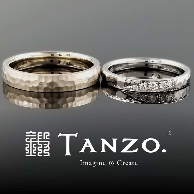 ■左のリング(男性リング)幅:3.5mm、厚み:1.7mm、表面加工:槌目加工・横ヘアライン加工