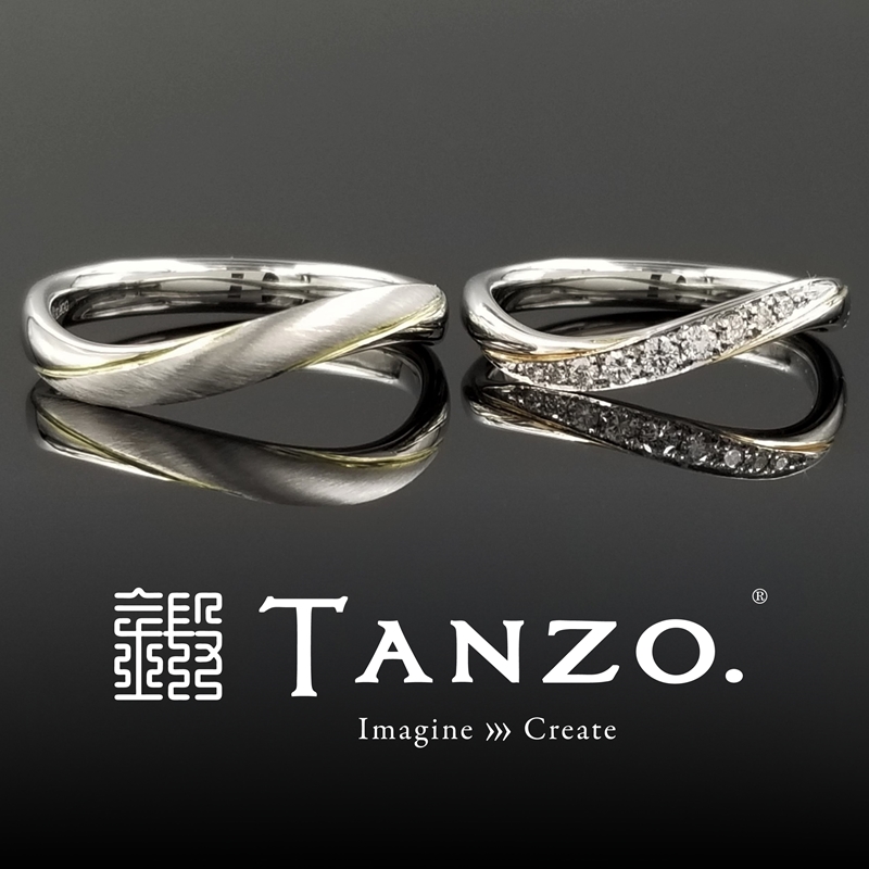 ■左のリング(男性リング)幅:3.0mm、厚み:1.7mm、S字ウェーブ(強)、表面加工:金線加工・斜めヘアライン加工・鏡面仕上げ