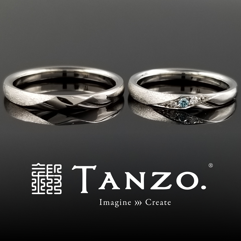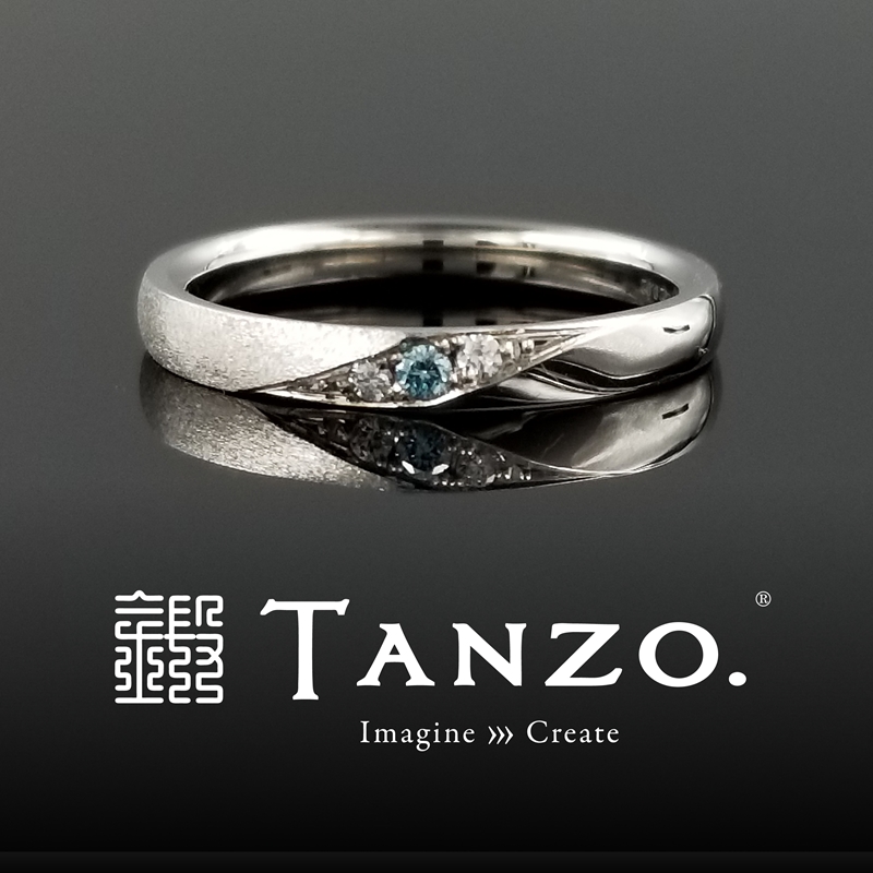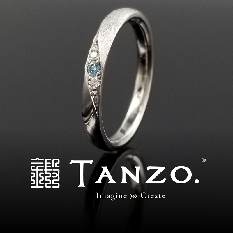 ■右のリング(女性リング)幅:2.5mm、厚み:1.7mm、表面加工:面取り加工・粗めマット加工(フェードアウト)・鏡面仕上げ・ダイヤ2石+ブルーダイヤ1石セッティング